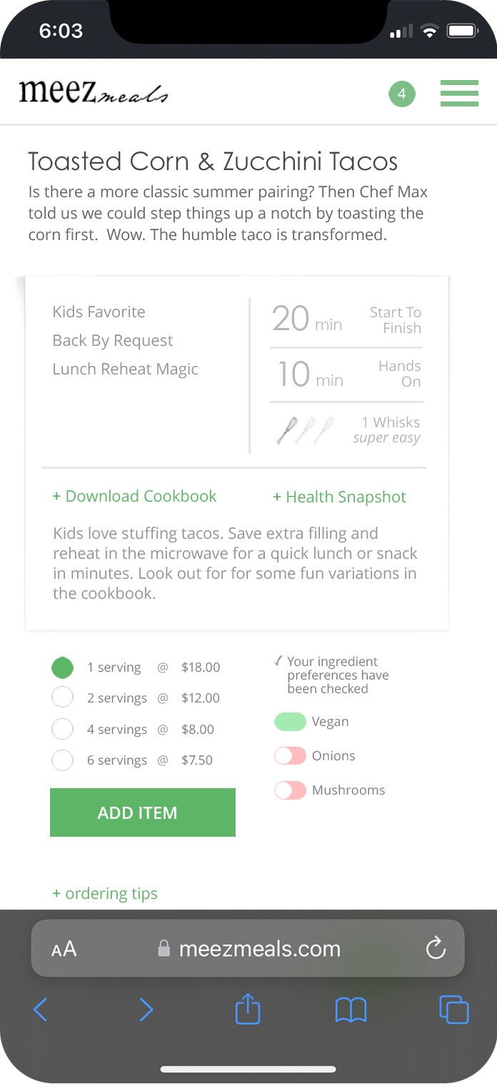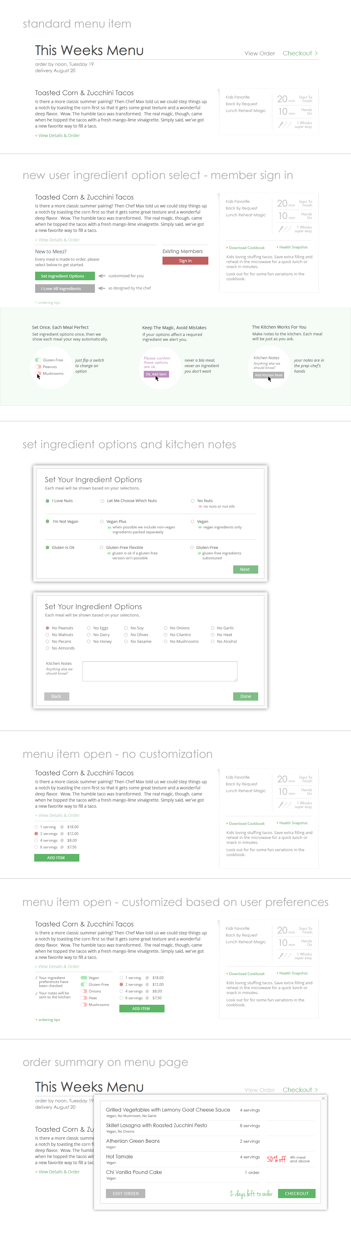 This shows how the ingredient options and kitchen notes are set, and different states of a menu item depending on the level of user customization.